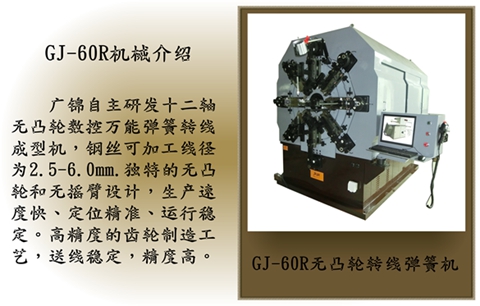 隨著無(wú)凸輪萬(wàn)能彈簧機(jī)的快速發(fā)展,傳統(tǒng)的有凸輪萬(wàn)能彈簧機(jī)由于調(diào)機(jī)復(fù)雜,速度慢等各種原因?qū)е缕渎蕴?,致使無(wú)凸輪轉(zhuǎn)線彈簧機(jī)正走向成熟。東莞市廣錦數(shù)控設(shè)備有限公司擁有十多年彈簧機(jī)研發(fā)經(jīng)驗(yàn)以及先進(jìn)調(diào)機(jī)裝配技術(shù),自主研發(fā)12軸無(wú)凸輪數(shù)控萬(wàn)能彈簧轉(zhuǎn)線成型機(jī)。