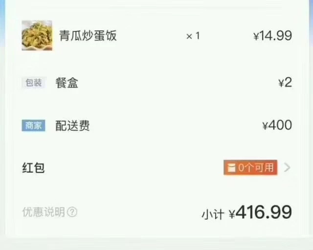 小李中午點(diǎn)了一份外賣(mài),雖然配送費(fèi)比往日貴了很多,但為了自己那嬌氣的胃,他還是點(diǎn)了外賣(mài)。